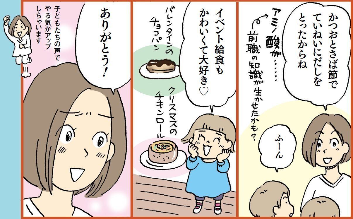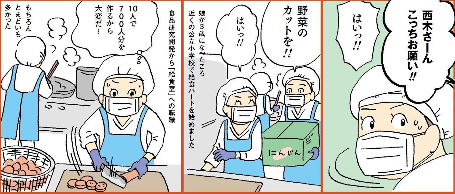 高等専門学校を卒業後、乳製品メーカーに就職。25歳で結婚。夫の就職で引っ越すことになり、妊娠6カ月で退職。26歳で長女を出産。29歳で給食パートをスタート。平日5日、9~15時で働く