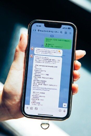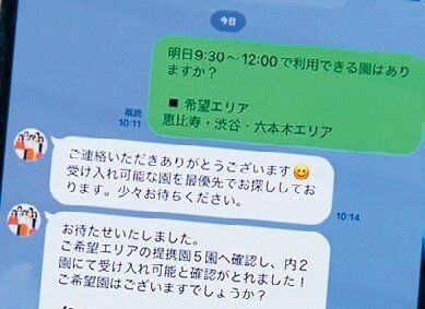 一時保育で子どもを保育園に預けるには、一般的に多くの書類の提出や事前登録、面談などが必要。「忙しくて疲れているおかあさんたちが、『手続きが面倒なら一時保育は諦めよう』と思うのは当然です」と田中さんはいいます。その点、「ちょこいく」は書類提出や面談、またアプリなどをダウンロードする必要などはなく、保育園探しから予約までLINEで完結。専属オペレーターが対応し、預けたい日時や場所などの相談から、預かり可能な保育園の提案まで、すべてLINEのやりとりで行います。