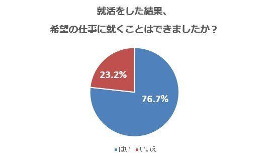 「就活(正社員、契約社員、紹介予定派遣)」(パート、アルバイトなどは除く)をした結果、希望の仕事に就くことができたか?聞いてみたところ、76.7%の人が「はい」と回答しました。