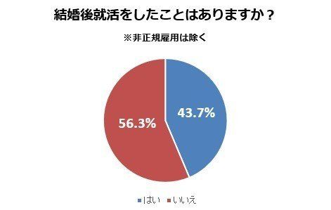 結婚してから再就職や転職のために「就活(正社員、契約社員、紹介予定派遣)」(パート、アルバイト、フリーなどは除く)をしたことがあるか?聞いたところ、43.7%の人が「はい」と回答しました。