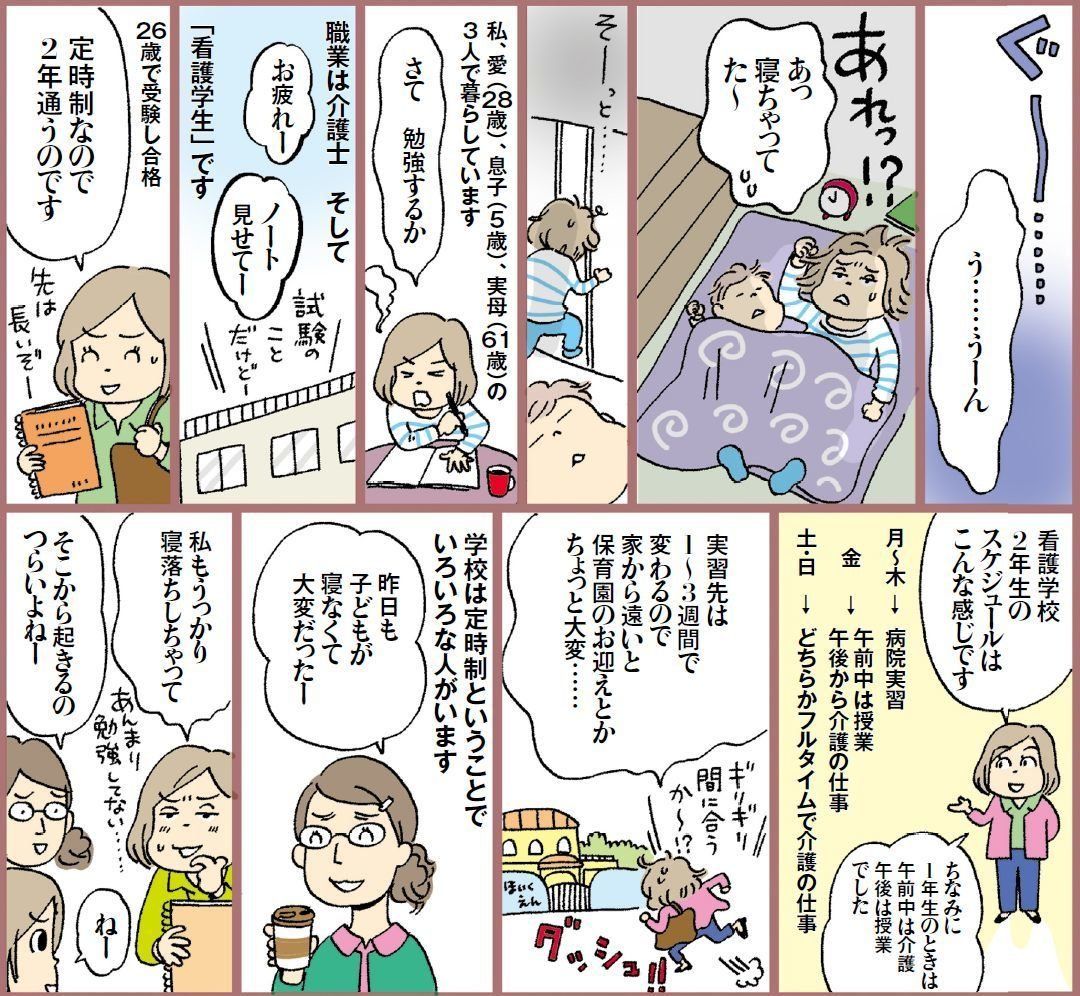 定時制の看護学校に通う介護士。正社員として病院で働く。母(61 歳)、長男(5歳)の3人家族