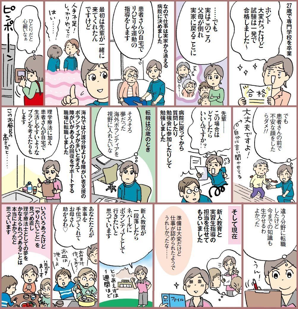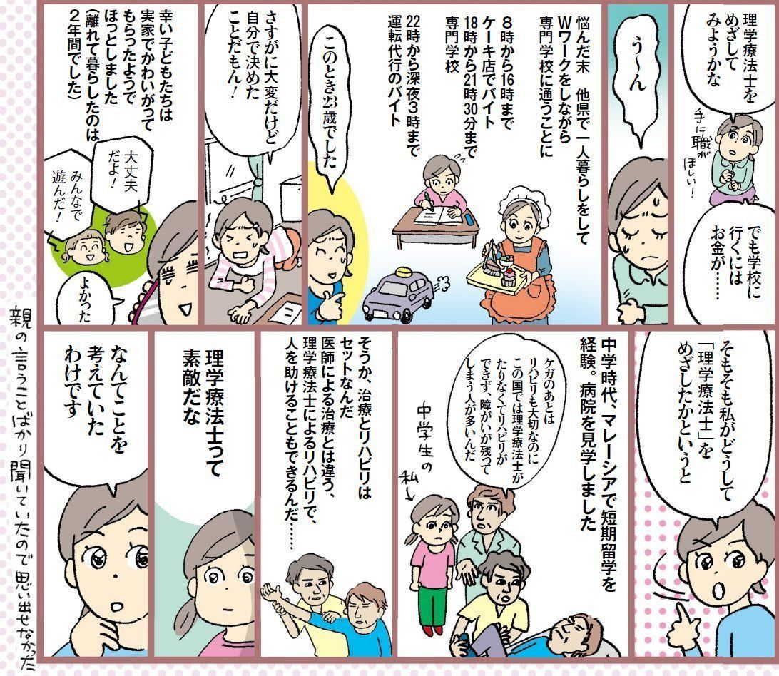 高校卒業後、旅館に就職して仲居になる。19 歳で結婚し長男を出産。育休を取り出産後3カ月で仕事復帰。22 歳で退職し長女出産、のち離婚を経験。23 歳で理学療法士養成の専門学校に入学。27 歳で資格を取り病院に就職。32 歳で現在の職場に転職