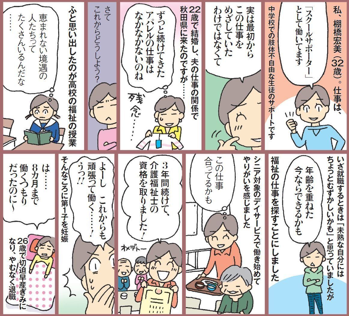 高校卒業後、アパレル会社に就職。22 歳で結婚し、介護業界に転職。25 歳で介護福祉士の資格を取得。26 歳で長男を出産。妊娠中に退職して専業主婦に。29 歳で長女を出産。31 歳で現職につき、仕事を再開