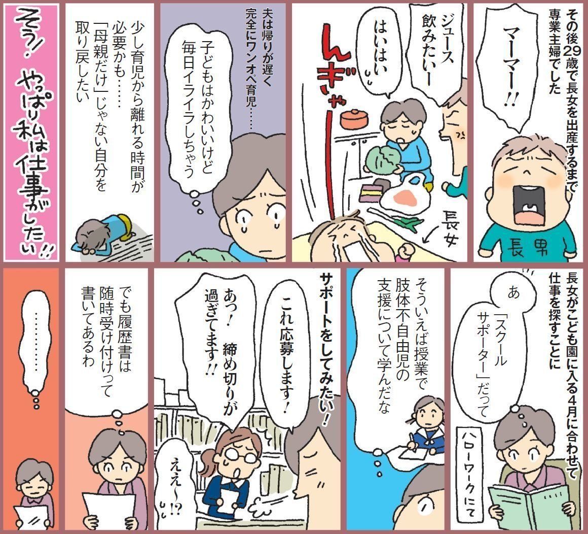 非常勤職員のスクールサポーター。公立中学校で体が不自由な生徒のサポートを行う。夫(33 歳)、長男(6歳)、長女(3歳)の4人家族