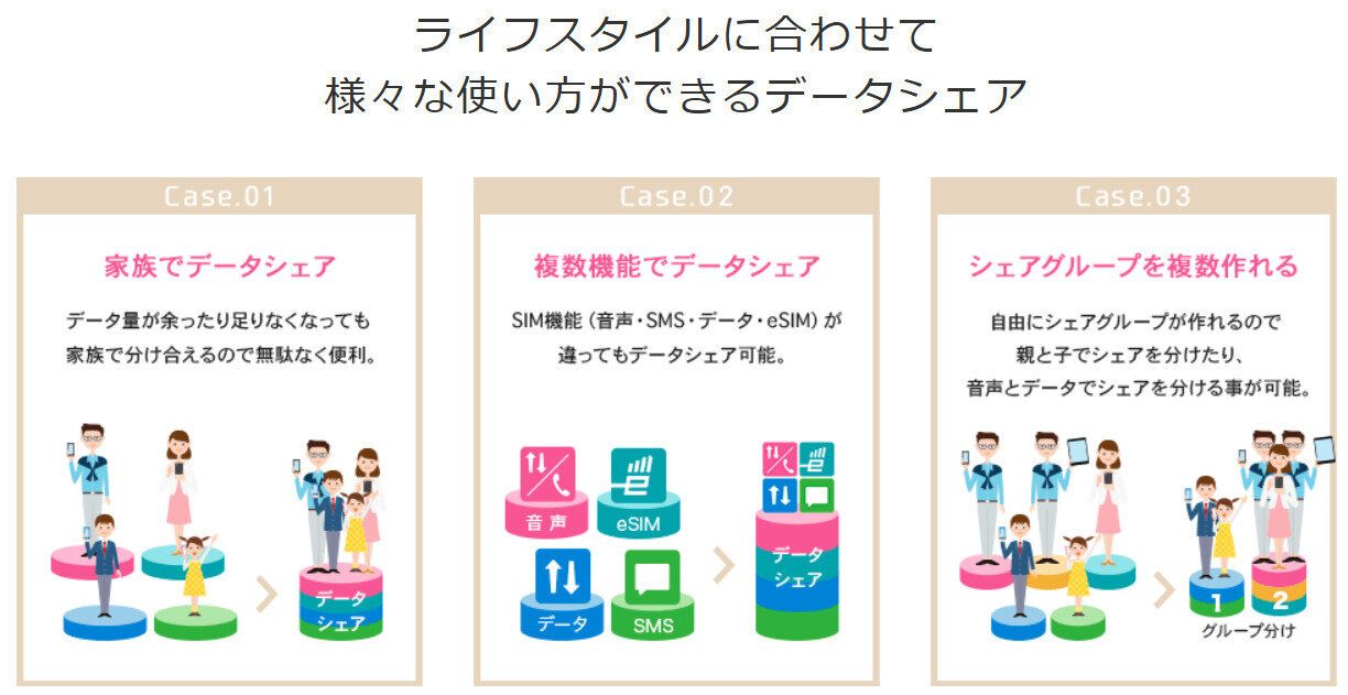 IIJmioでは、同一mioID内で契約する回線をお持ちの場合、無料で「データ容量シェア機能」と「データ容量プレゼント機能」という機能があります。これがなかなか便利な機能で、家族同士でギガを分け合ったりプレゼントしたりして、無駄なくギガを活用することができちゃうんです。