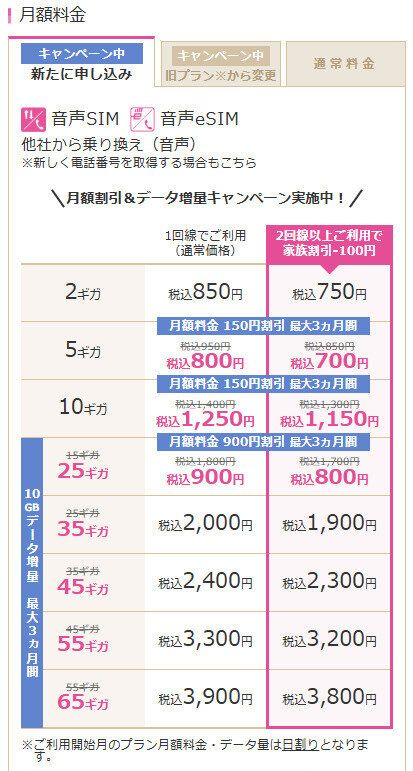 ハッピースマイルキャンペーン(終了日未定)では最大3ヵ月間25ギガが900円、5ギガは800円、10ギガは1,250円で利用できます。現在お使いのプランと是非比較してみてください。