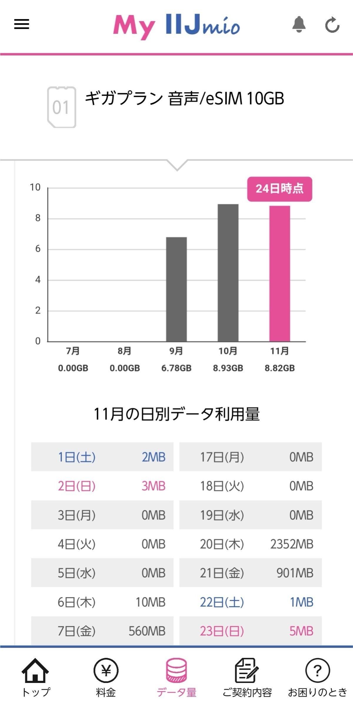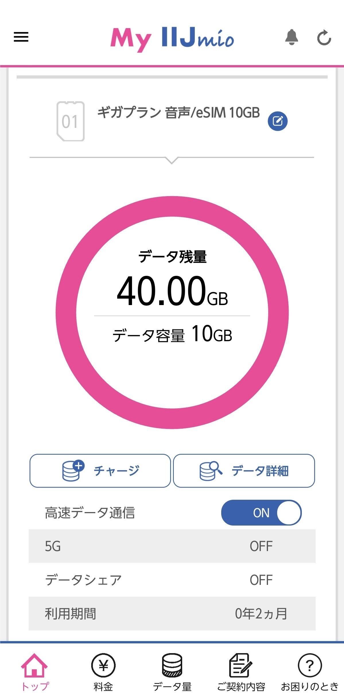 10ギガプランを契約したところ、データ増量キャンペーンの適用で月20ギガが月額900円で使えるように。実際の使用量はそれほど多くなかったため、前月からの繰り越し分と合わせて、今月は40ギガも使える状態になっています。
