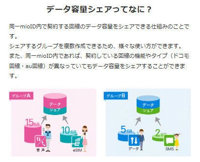 家族でデータを無料でシェア(同一mioID内のみ)できるのも、魅力の一つです。例えば、子どもがついデータを使いすぎたときも、アプリで簡単に家族でデータを分け合えるので無駄なく便利です。