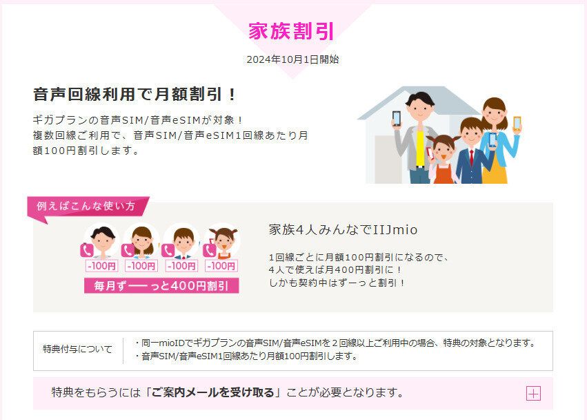家族割引とは、音声回線を2回線以上ご利用で1回線ごとに毎月100円OFFになる制度で、家族でまとめて契約する方には嬉しいサービスです!