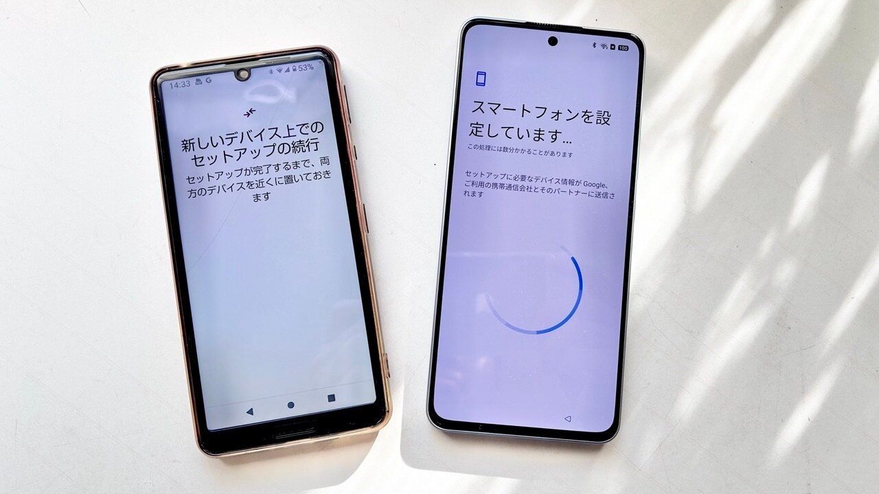 まずはGoogleアカウントの案内に沿ってデータ移行。Android同士の機種変更だったため、古い端末を近くに置いて接続を許可するだけで、Wi-Fi設定からアプリの移行までタップするだけで進んでいきます。