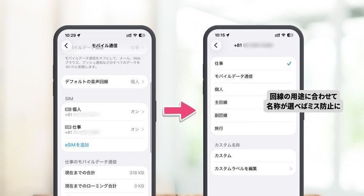 回線名は初期設定のままだと「主回線」「副回線」と表示されますが、例えば「個人」「仕事」に変えたり、オリジナルの名称をつけることができますから、わかりやすく間違えにくい名称にしておけば、さらにミス防止になります。