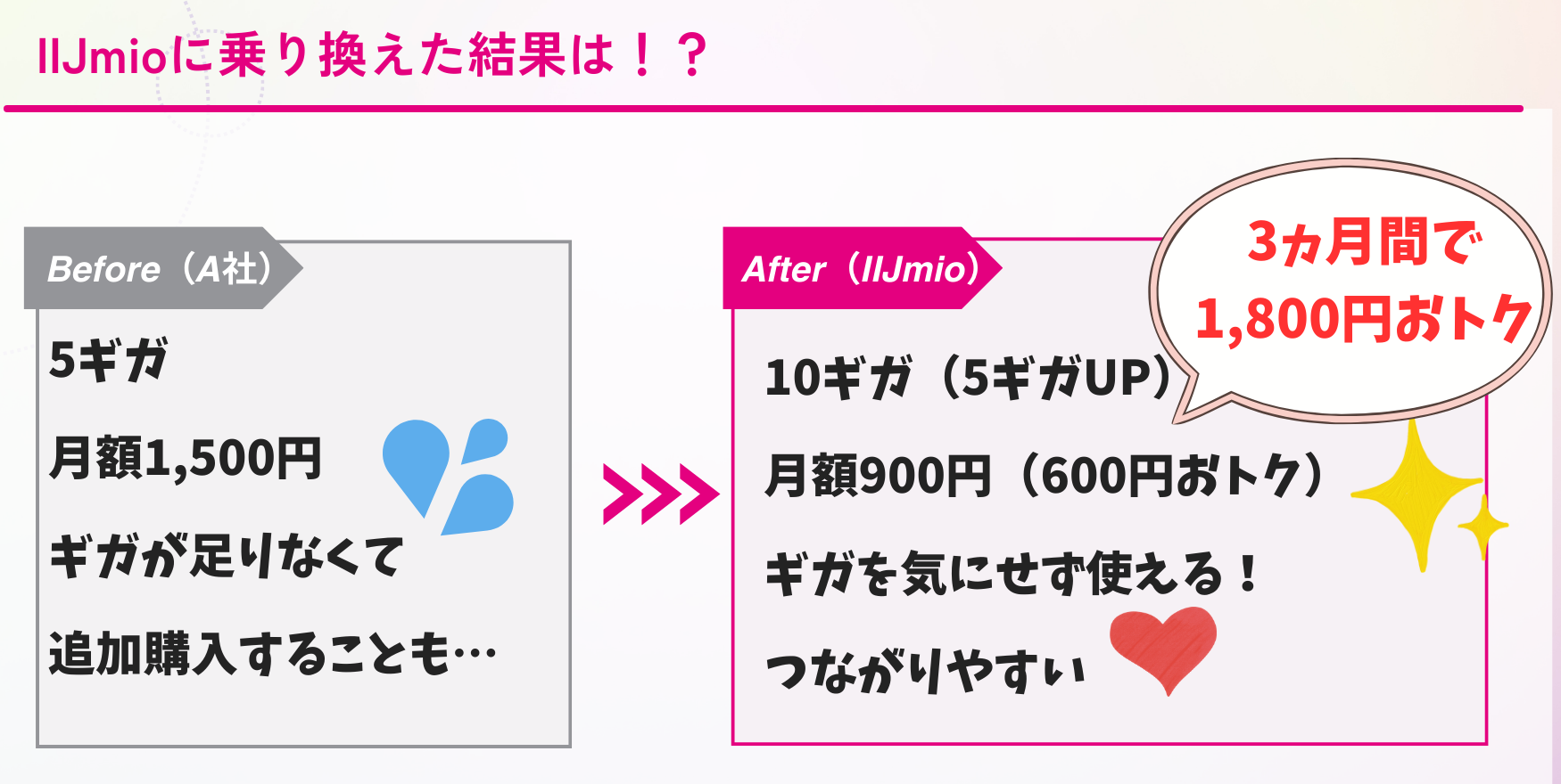 以前利用していた他社の5ギガ月額1,500円プランに比べて、使えるギガが倍になり、月々の通信費を600円減らせて、3ヵ月間で1,800円の節約に成功しました!
