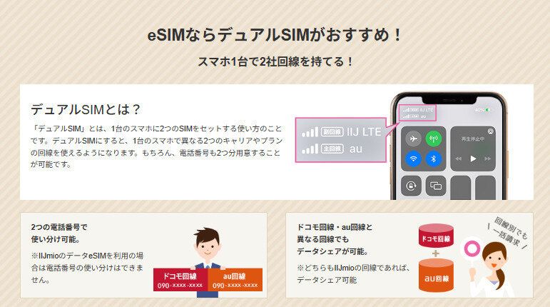 ちなみにeSIMは、物理SIMやもう一枚eSIMと組み合わせて「デュアルSIM」として使うこともできます。仕事用とプライベート用に2つ番号が必要なかたにもおすすめです。