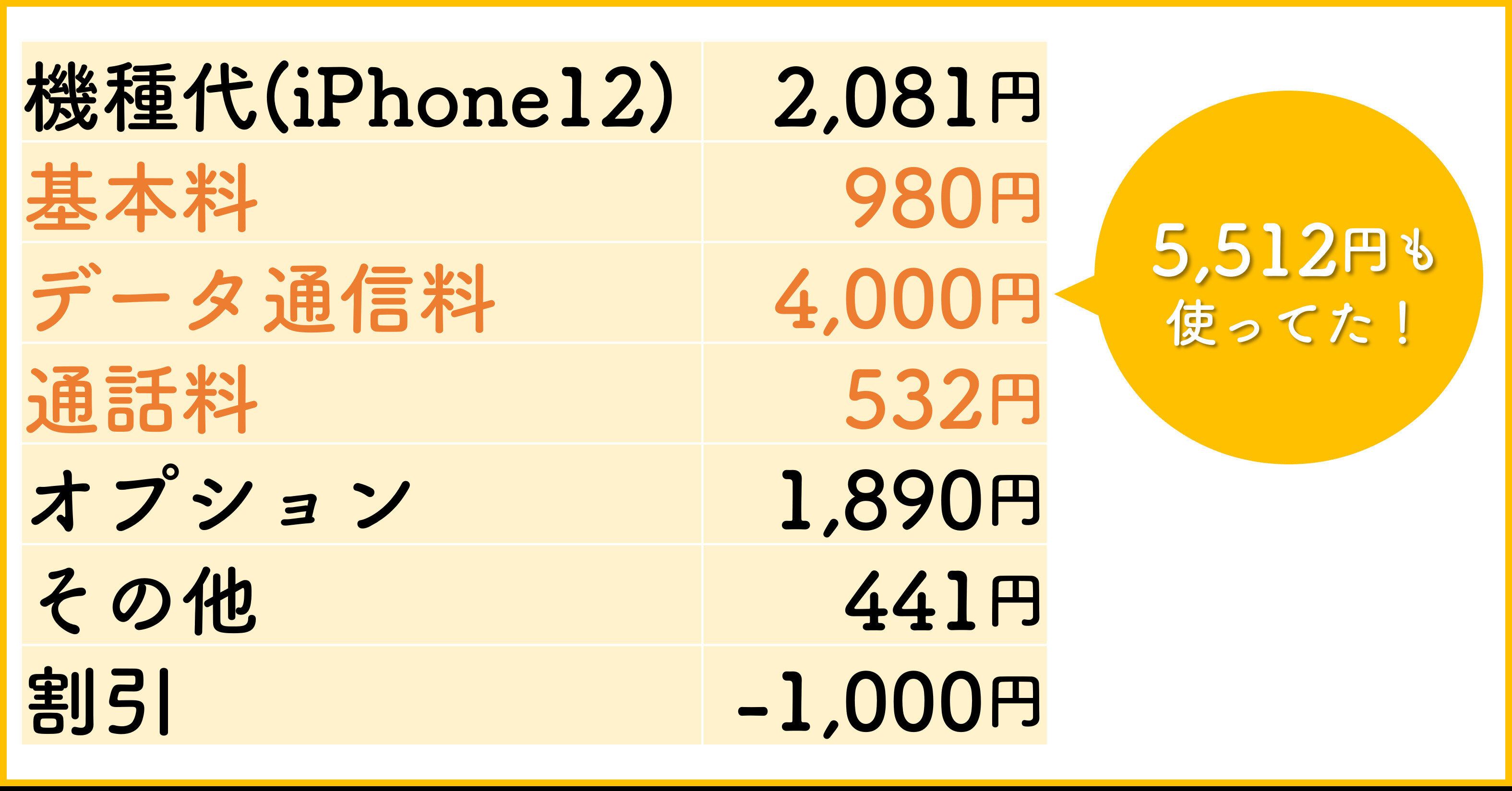 IIJmioに乗り換え前のとある月の通信費です。大手キャリアを使っていましたが、基本料、データ通信料、通話料だけで5,512円にもなっています。