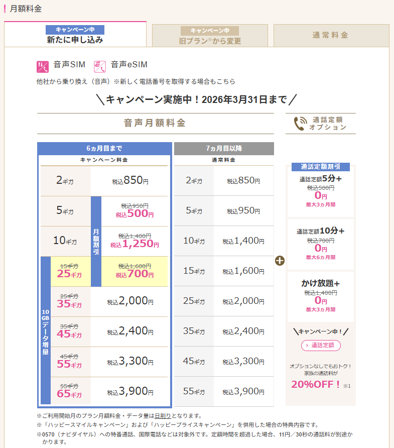 そして、さらに3/31までは通常15ギガ月額1,600円が、最大6ヵ月間10分かけ放題コミ+10ギガ増量&900円割引で「25ギガ月額700円」に!